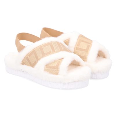 Sandália na cor Creme. O modelo tem solado flatform branco, com LL em alto relevo e bico arredondado. Possui pelo sintético na cor Creme. Tem tiras médias cruzadas no cabedal, com aplicação de gorgorão exclusivo Luz da Lua. O fechamento é com elástico na parte traseira. Detalhe para traseiro aberto.
