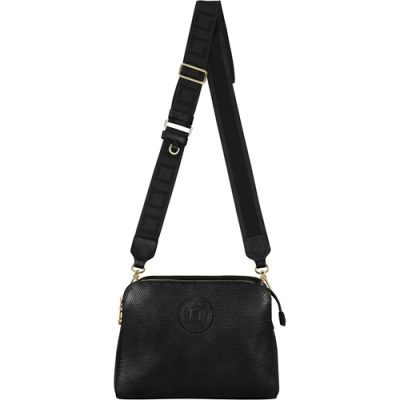 Bolsa Luz da Lua Bella em couro na cor Preta, com textura Ordine. O modelo traz alça tiracolo larga em gorgorão exclusivo Luz da Lua. Possui três divisórias internas, fecho superior em zíper, puxador e metais dourados. Detalhe para a tag emborrachada, na cor do produto, personalizada com Monograma da marca na parte frontal.