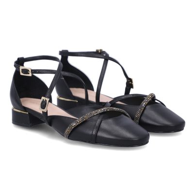 Sapatilha Luz da Lua em couro. O modelo tem bico arredondado e salto baixo, com aplicação de peça dourada. Possui tiras finas sobre os dedos e peito do pé e aplicação de tira com cristais. O fechamento é com tira no tornozelo e fivela em metal exclusivo Luz da Lua. Detalhe para traseiro fechado.
