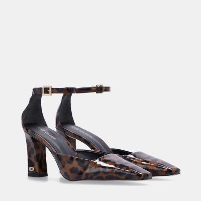Scarpin com cabedal em couro. Traseiro fechado com fechamento de fivela no tornozelo. Salto forrado em couro com aplicação de metal delicado. Altura do salto: 8,5 cm