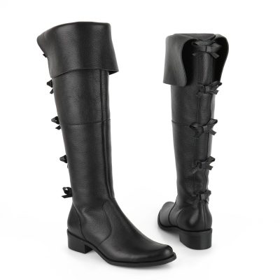 Bota de couro, com cano alto e salto baixo. O modelo tem bico redondo e fechamento com zíper na parte interna. Detalhe para o enfeite em formato de laço na parte de trás. A bota cano alto Luz da Lua pode ser utilizada tanto over the knee, acima do joelho, como cano alto abaixo do joelho, dobrando o cano e deixando o forro em couro para fora. Salto baixo tamanho 4 cm.
