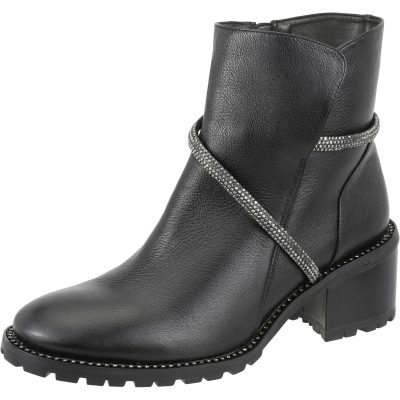 Bota cano curto em couro na cor Preta. O modelo tem salto médio geométrico, bico redondo e solado tratorado. Possui fechamento em zíper na lateral. Detalhe para a tira com cristais aplicada no cabedal e para os cristais no contorno do solado da bota.