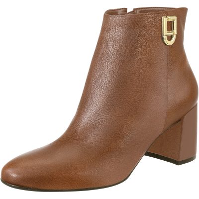 Bota de couro Luz da Lua. O modelo tem cano curto, salto geométrico e bico arredondado. Traz fechamento em zíper na lateral, com puxador dourado exclusivo Luz da Lua. Detalhe para enfeite de metal ouro na lateral da bota.
