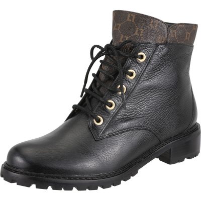 Bota em couro na cor Preta, com cano curto. O modelo possui sobreposição em peça Monograma Mocca. Tem salto baixo, bico redondo e solado tratorado. Possui fechamento com cadarço e tem ilhós em metal dourado.