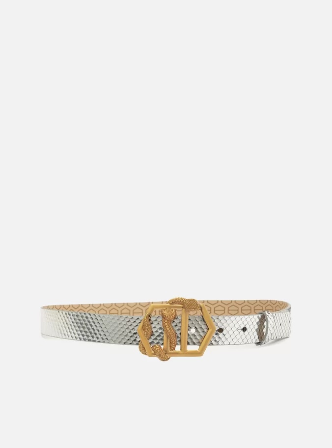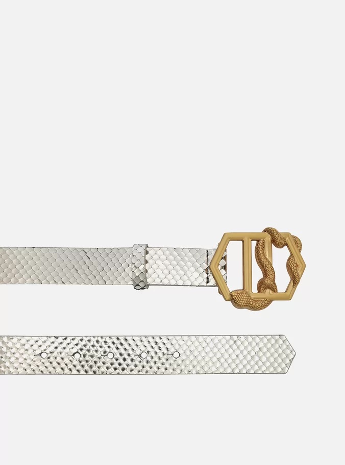 Cinto Arezzo de couro com textura snake. O modelo vem em tira média e possui interno com monograma da marca. Traz fivela de metal, dourada, geométrica e vazada com detalhe de cobra. Para uso na cintura, é regulável e tem passador em tira.