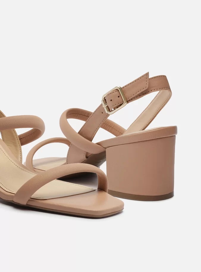 O modelo tem salto baixo bloco e bico quadrado. Traz tiras médias bombadas sobre os dedos e no peito do pé. Aberta, possui tira média em torno do calcanhar com fechamento em fivela metálica lateral. Com palmilha bege e gravação do nome da marca. A sandália exibe todo o pé.