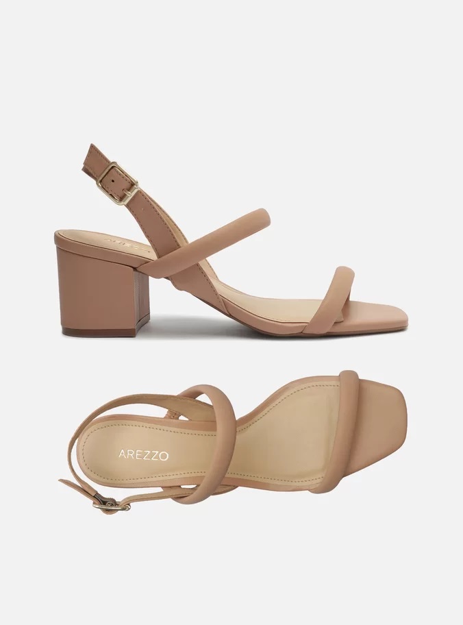 Sandália Arezzo de couro. O modelo tem salto médio bloco em fachete e bico redondo. Traz cabedal semi-fechado com recorte frontal para os dedos, além de tira em torno do calcanhar com fechamento em fivela metálica e detalhe em costura pesponto e rebite. Com palmilha da cor da sandália e gravação do nome da marca. A sandália exibe todo o pé.