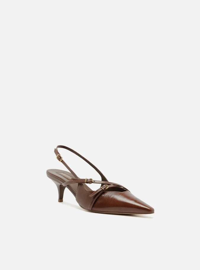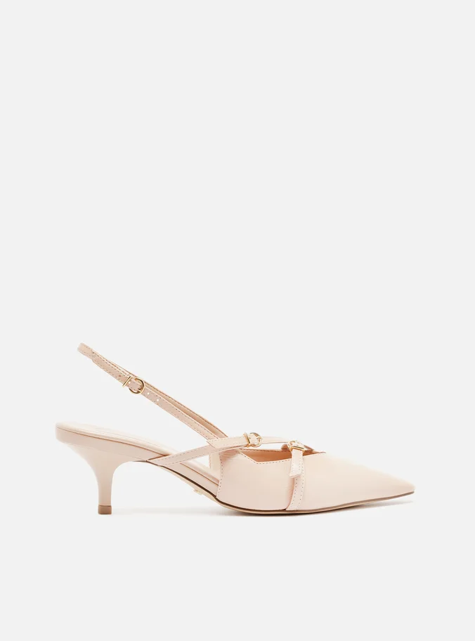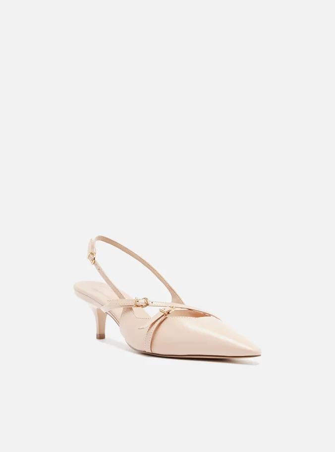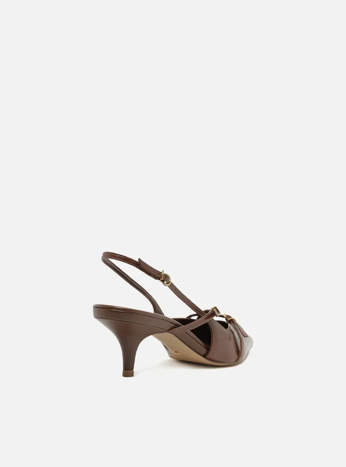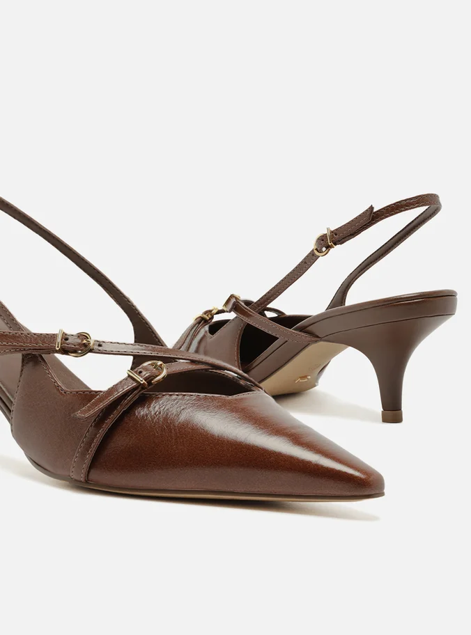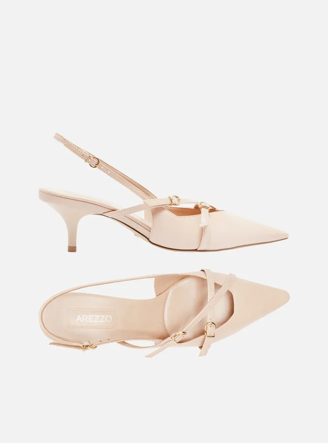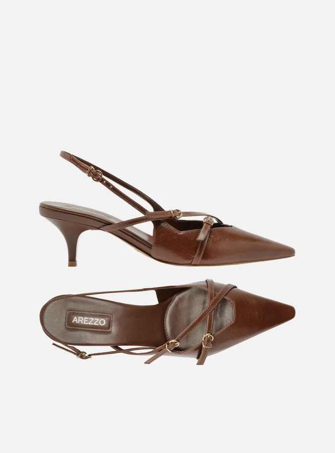 Slingback Arezzo em couro. O sapato tem salto médio fino e ponta fina. Aberto, traz recorte geométrico no cabedal. Possui tira fina conectada ao cabedal, que segue pelas laterais, contorna o calcanhar e fecha em fivela metálica. Tem mais duas tiras afiveladas sobre a parte superior do pé, sendo uma na diagonal. Com palmilha da cor do sapato e inscrição do nome da marca. Exibe toda parte superior do pé e traseira.