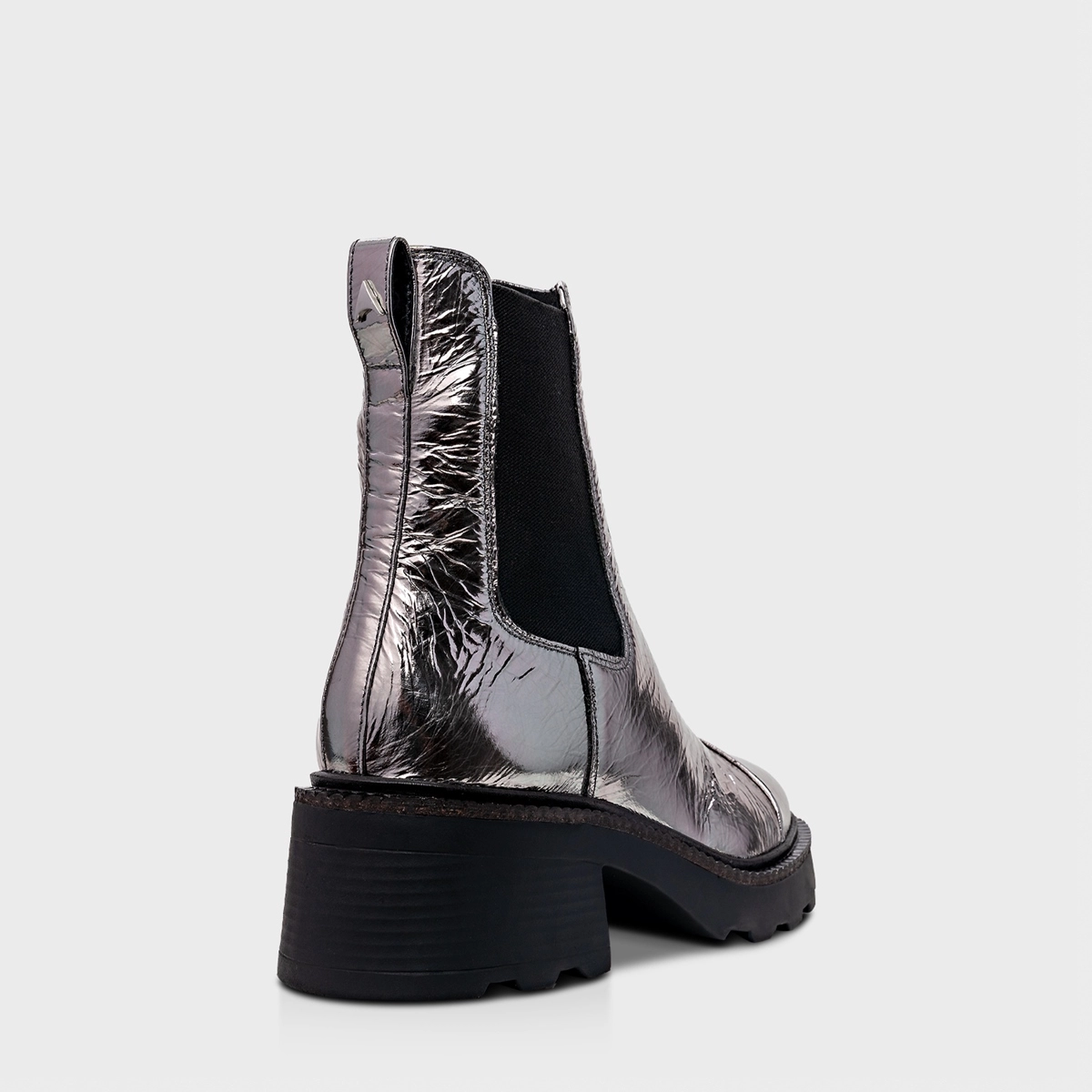 Bota em couro na cor Preta, com cano curto. O modelo tem salto bloco, bico arredondado e solado tratorado. Possui fechamento com zíper na lateral com puxador exclusivo Luz da Lua. Tem sobreposição em peça de couro verniz Verona. Detalhe para aplicação dos cristais ao redor do cabedal.