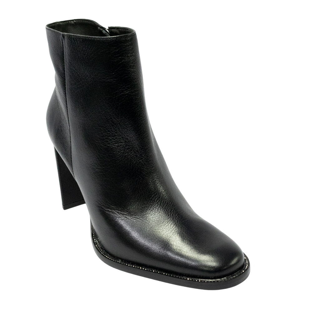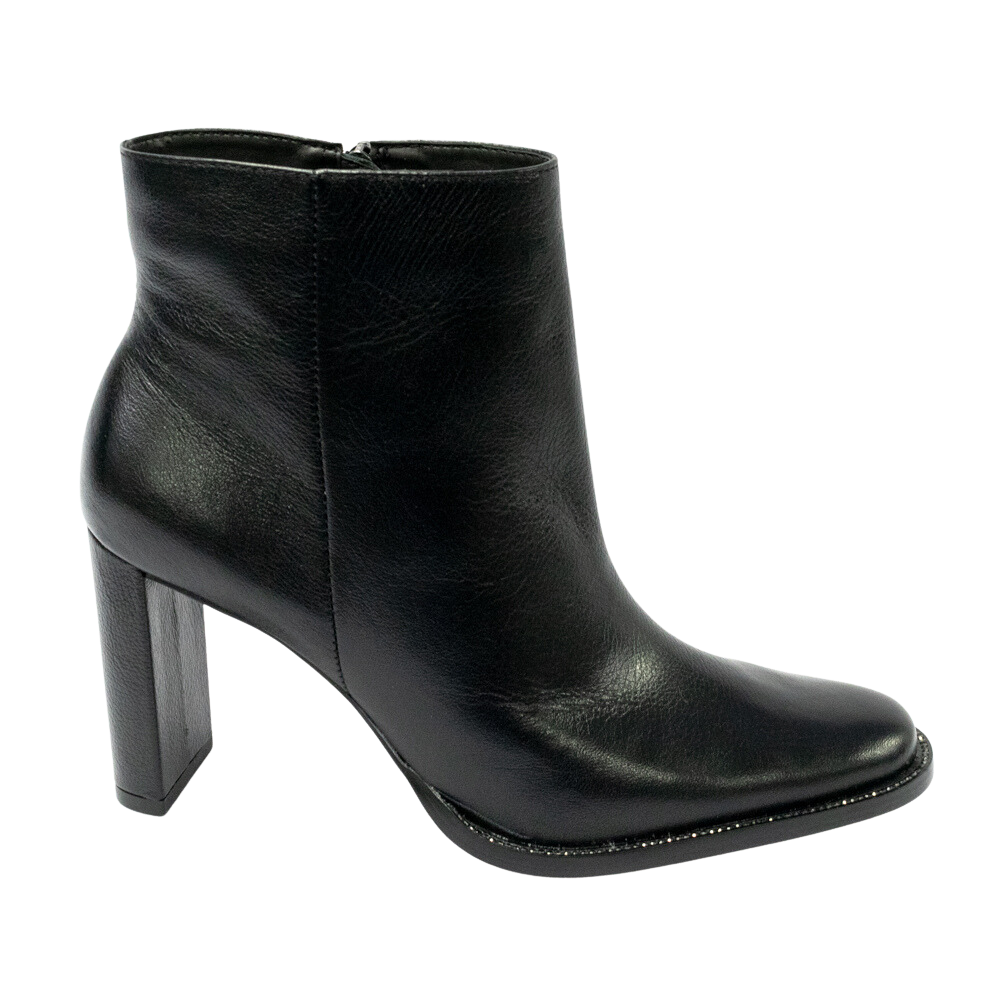 Bota Luz da Lua em couro. O modelo tem cano curto, salto geométrico e bico fino. Traz fechamento em zíper na lateral, com puxador dourado exclusivo Luz da Lua. Detalhe para aplicação de cristais ao redor da biqueira da bota.