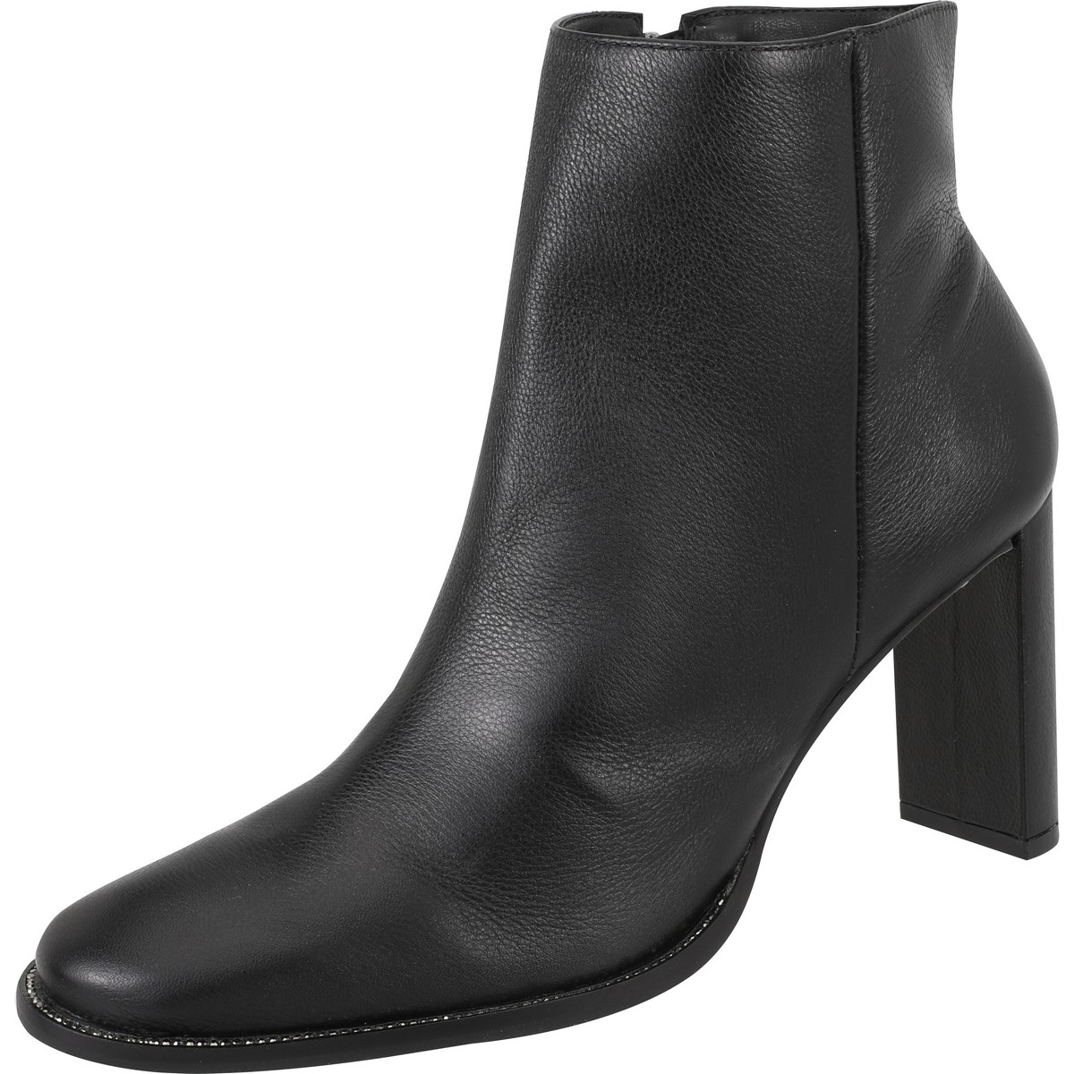 Bota de couro Luz da Lua 85911, tem cano curto e salto alto geométrico. O modelo tem bico quadrado e metal dourado na ponta. Traz fechamento em zíper, com puxador dourado e logo Luz da Lua. Detalhe para o enfeite com metal ouro.