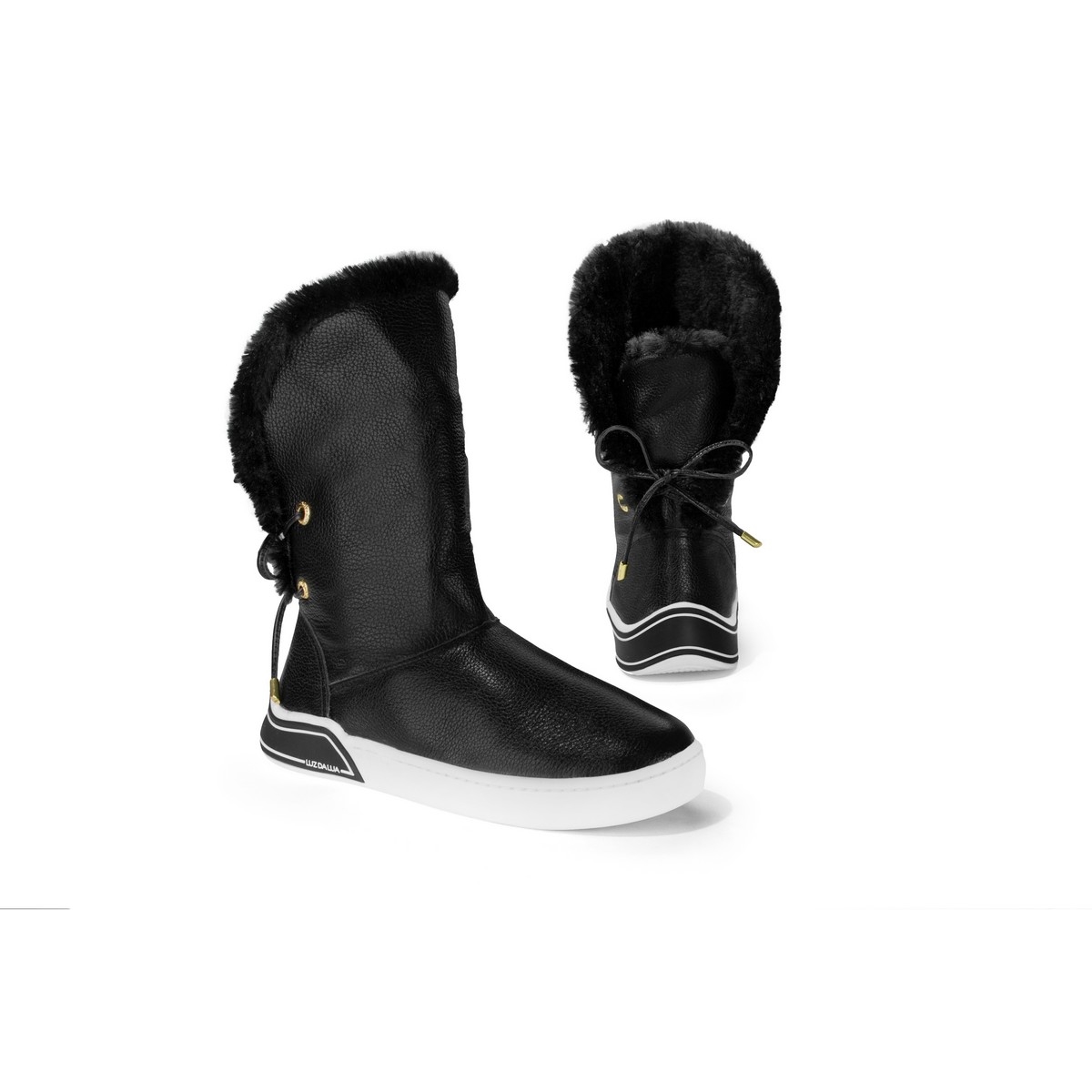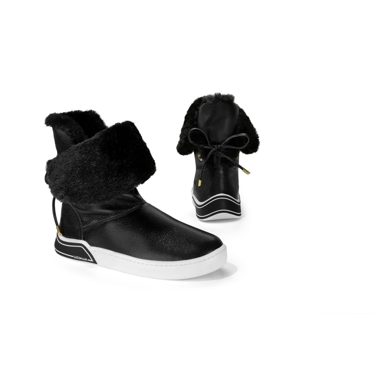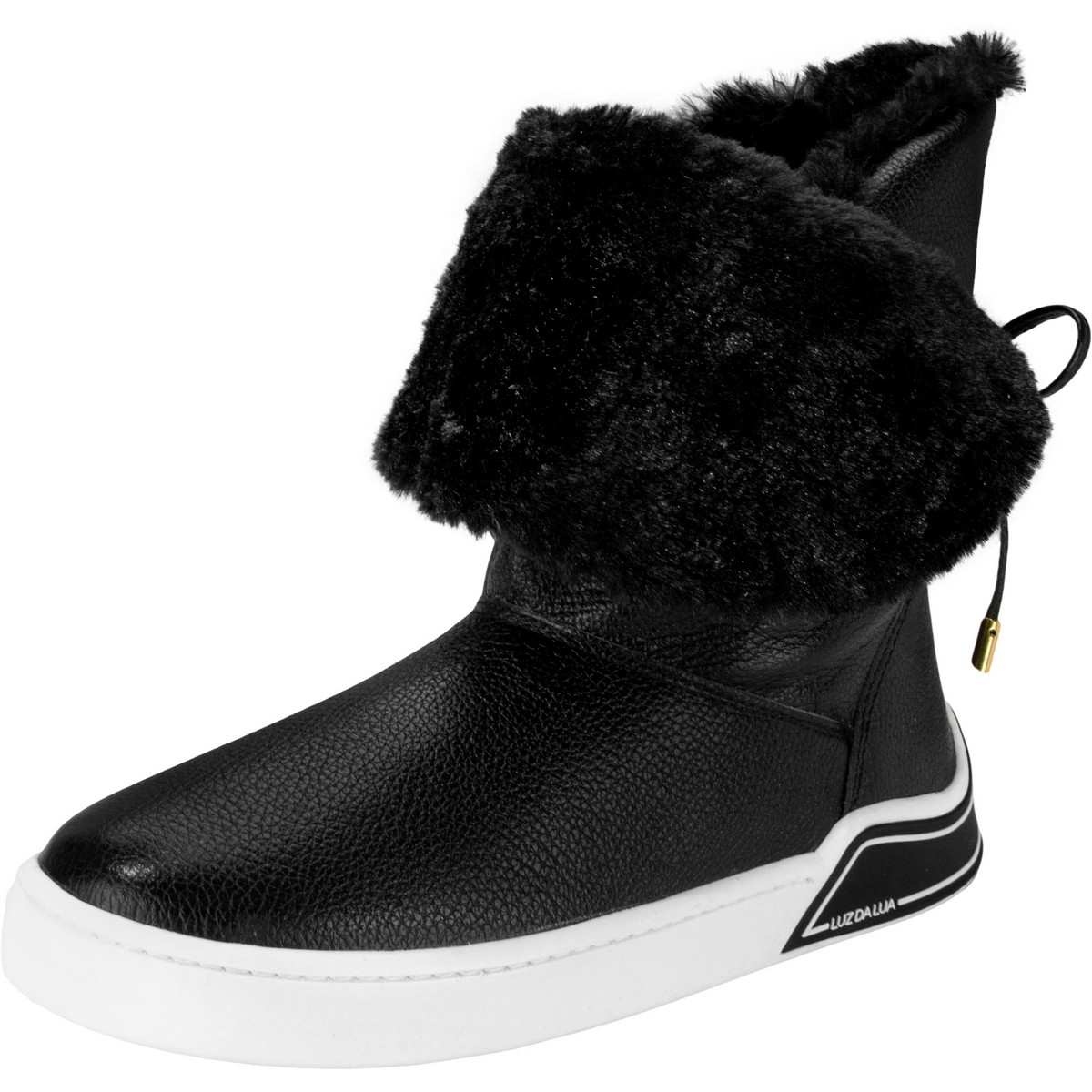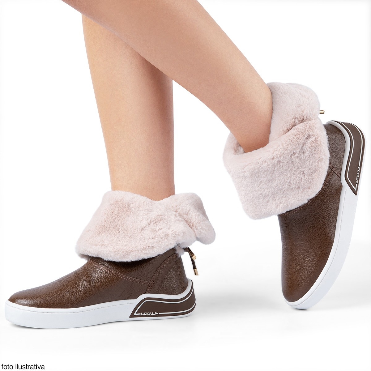 Luz da Lua Tênis boot, em couro. Possui salto médio flat na cor branca, bico redondo e parte interna do cano revestida com pelos sintéticos na cor do produto. A amarração é com cadarço na parte traseira, e com ponteira dourada. O modelo pode ser utilizado como cano médio, ou cano curto, dobrando o cano e deixando os pelos para fora.