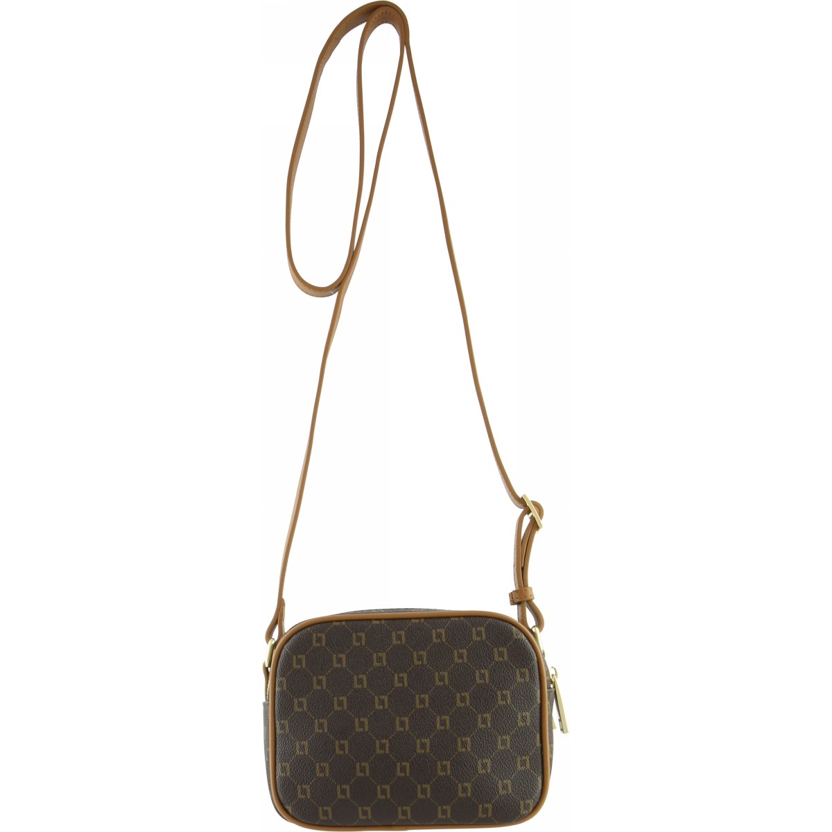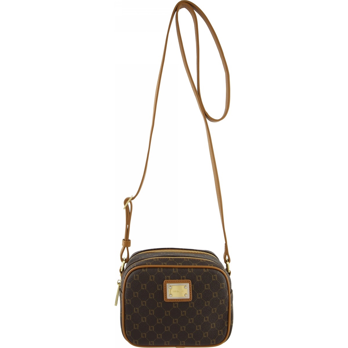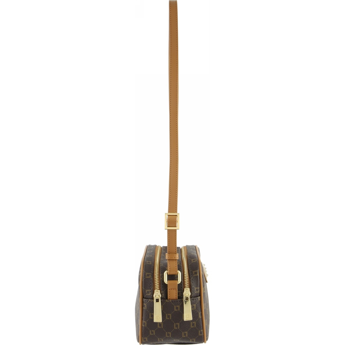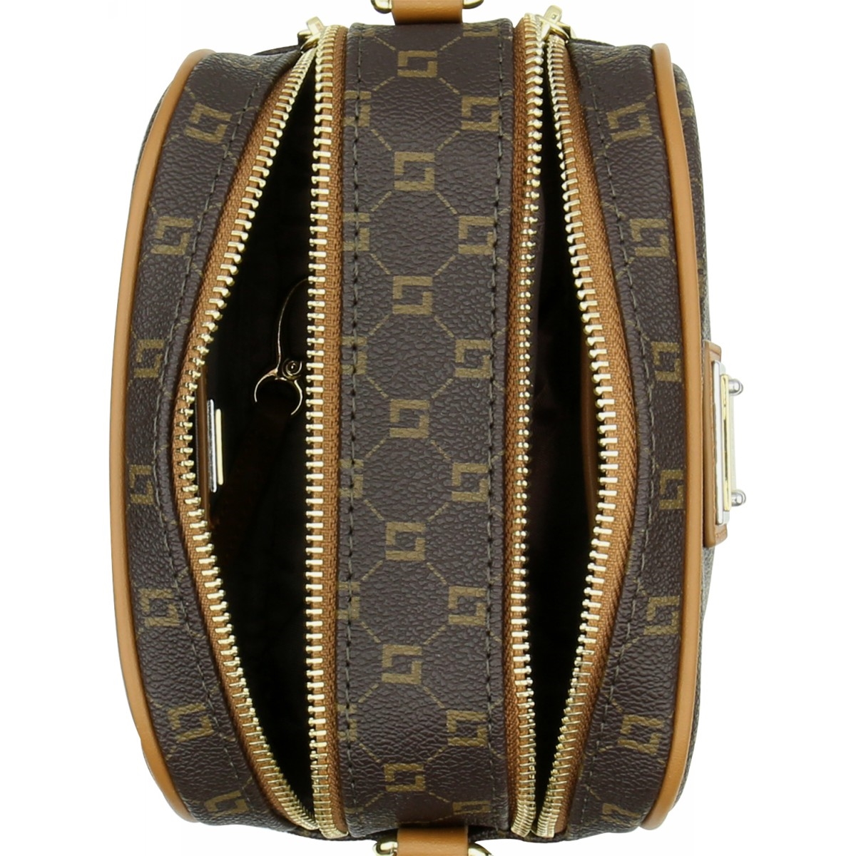Bolsa Monograma. Modelo estruturado, tem formato quadrado e tamanho pequeno. Traz alça longa ajustável, em couro Marrom Amêndoa. Possui fecho duplo na parte superior em zíper para dois compartimentos internos. Na parte frontal, placa exclusiva Luz da Lua. Detalhe para os metais na cor dourada.