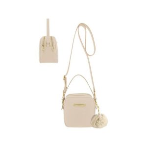 Bolsa tiracolo Luz da Lua em couro. O modelo tem formato estruturado e tamanho pequeno. Possui alça de mão e alça tiracolo de couro com regulagem. O fechamento principal é com dois zíperes, com puxadores em metal dourado. Detalhe para aplicação da placa LL na parte frontal e bag charm pom pom que acompanha a bolsa.