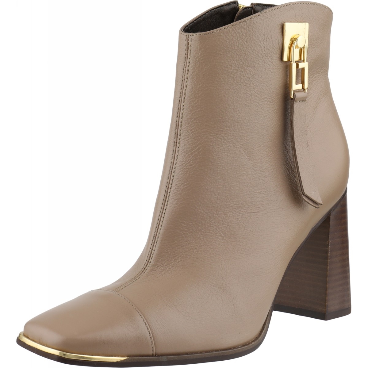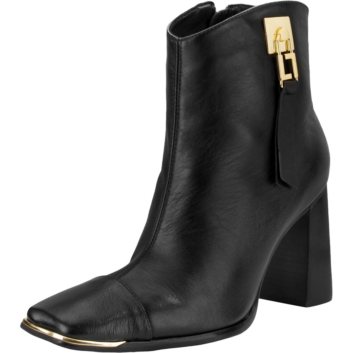 Bota de couro Luz da Lua 85911, tem cano curto e salto alto geométrico. O modelo tem bico quadrado e metal dourado na ponta. Traz fechamento em zíper, com puxador dourado e logo Luz da Lua. Detalhe para o enfeite com metal ouro.