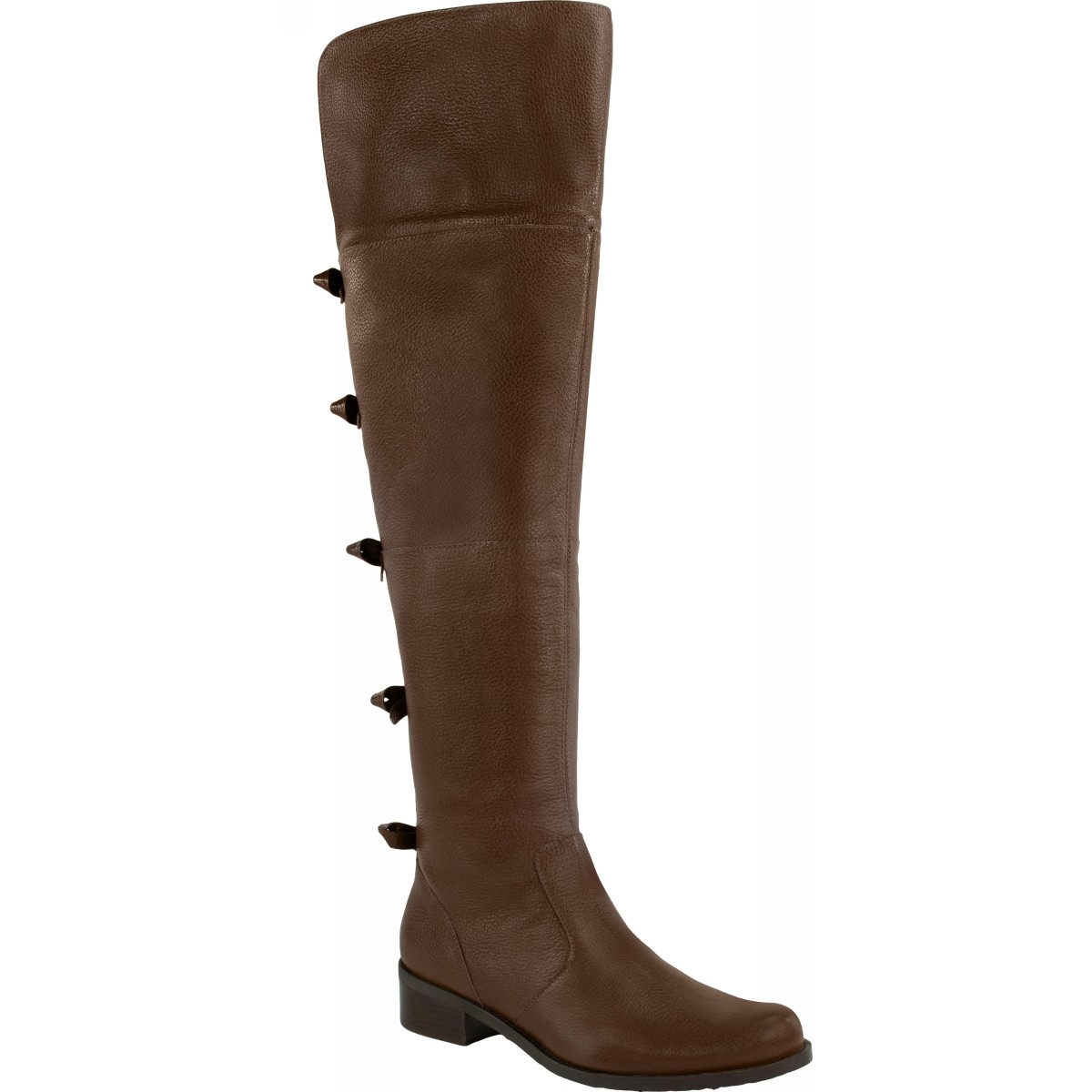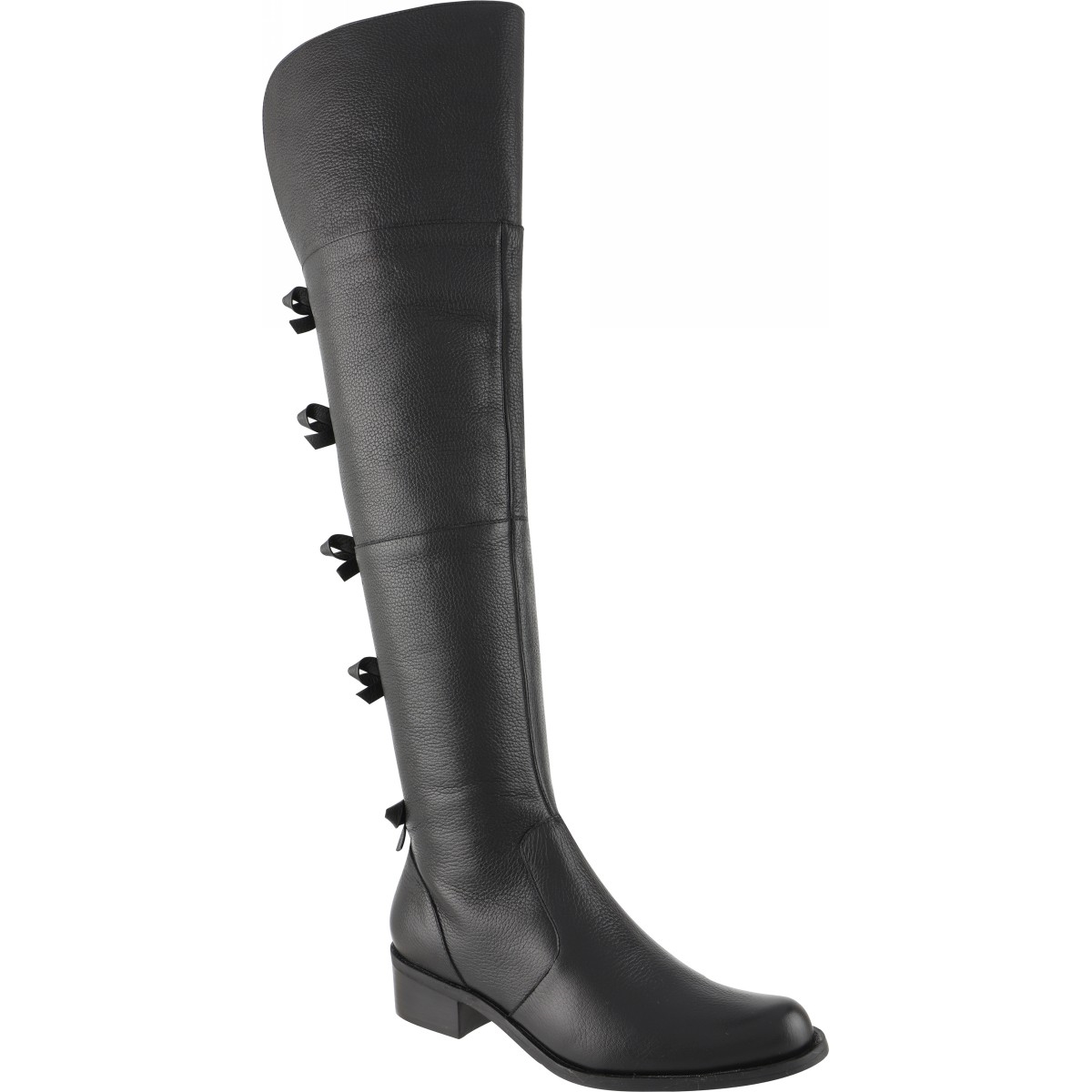 Bota de couro, com cano alto e salto baixo. O modelo tem bico redondo e fechamento com zíper na parte interna. Detalhe para o enfeite em formato de laço na parte de trás. A bota cano alto Luz da Lua pode ser utilizada tanto over the knee, acima do joelho, como cano alto abaixo do joelho, dobrando o cano e deixando o forro em couro para fora. Salto baixo tamanho 4 cm.