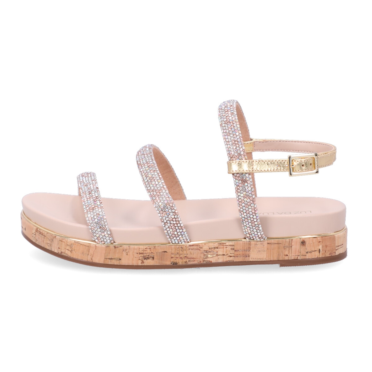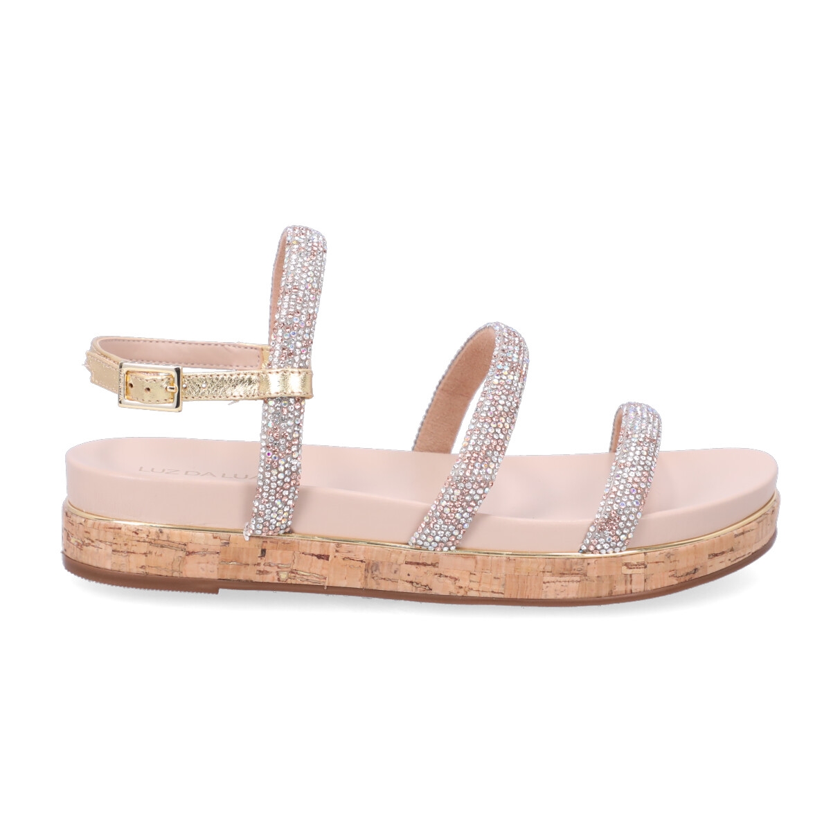 Rasteira Luz da Lua em couro.. O modelo tem salto baixo flatform em cortiça. Possui bico arredondado, tiras finas com aplicação de cristais sobre os dedos e peito do pé. Tras tira final na cor Gold em torno do tornozelo, com fechamento em fivela dourada.