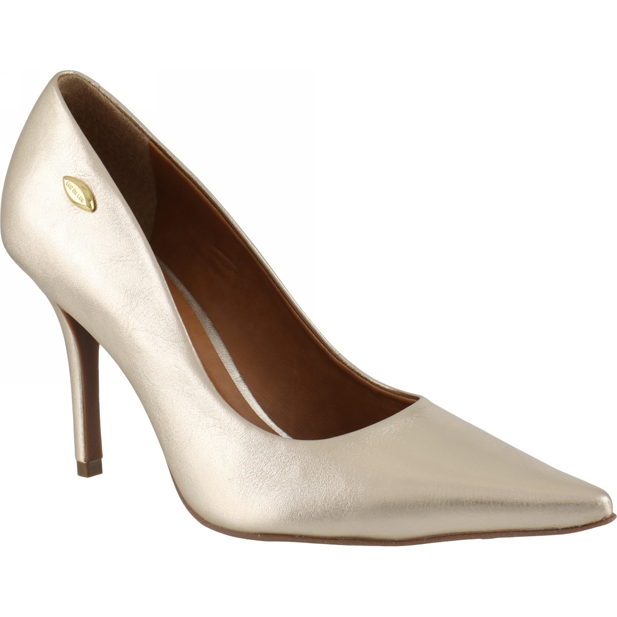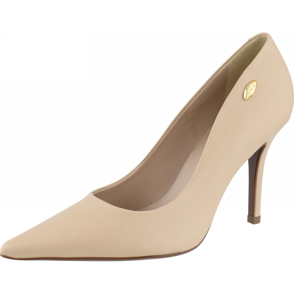Scarpin em couro. O modelo tem bico fino e salto alto fino. Possui recorte arredondado e laterais que acompanham a anatomia do pé. Detalhe para o metal dourado personalizado Luz da Lua.