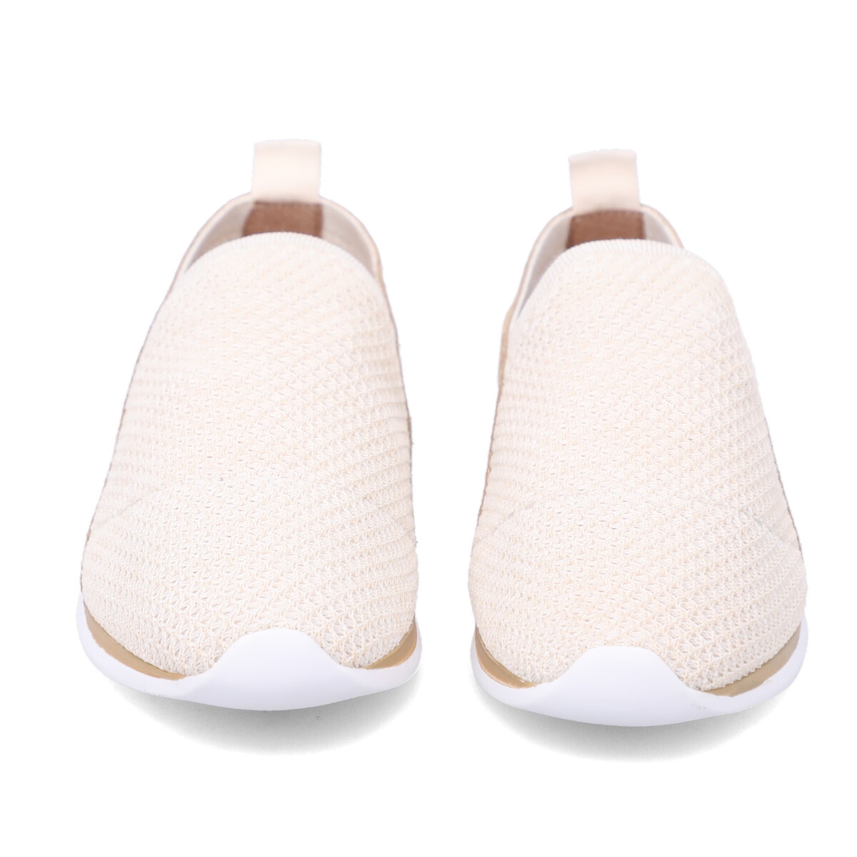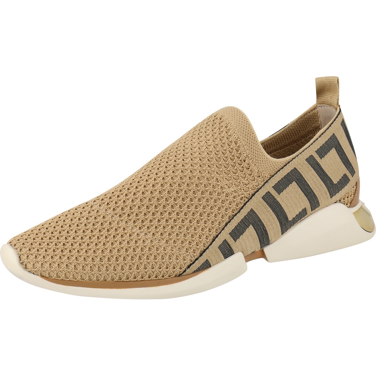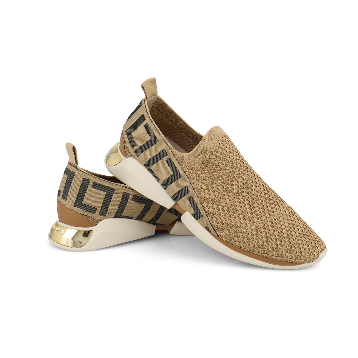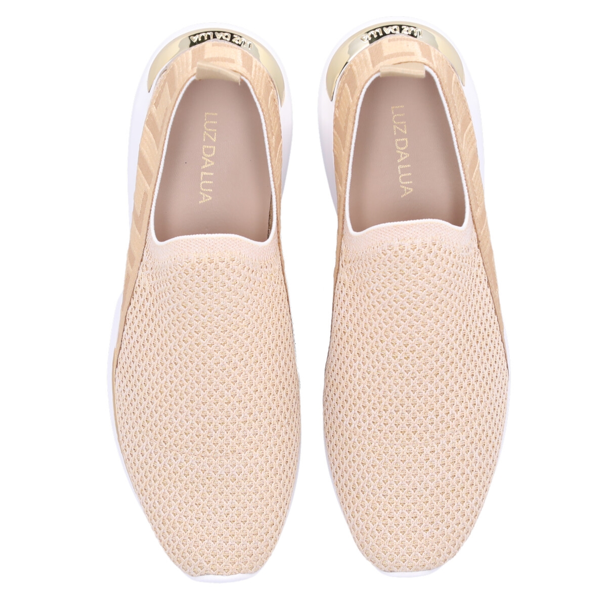 Tênis Space em knit. O modelo possui solado extraleve branco com aplicação de placa dourada Luz da Lua na parte traseira e bico redondo. Tecido macio que se ajusta ao pé e uma faixa em gorgorão na cor Areia com a identidade exclusiva da marca. Detalhe para peça de couro no calcanhar e puxador que facilita o calce.